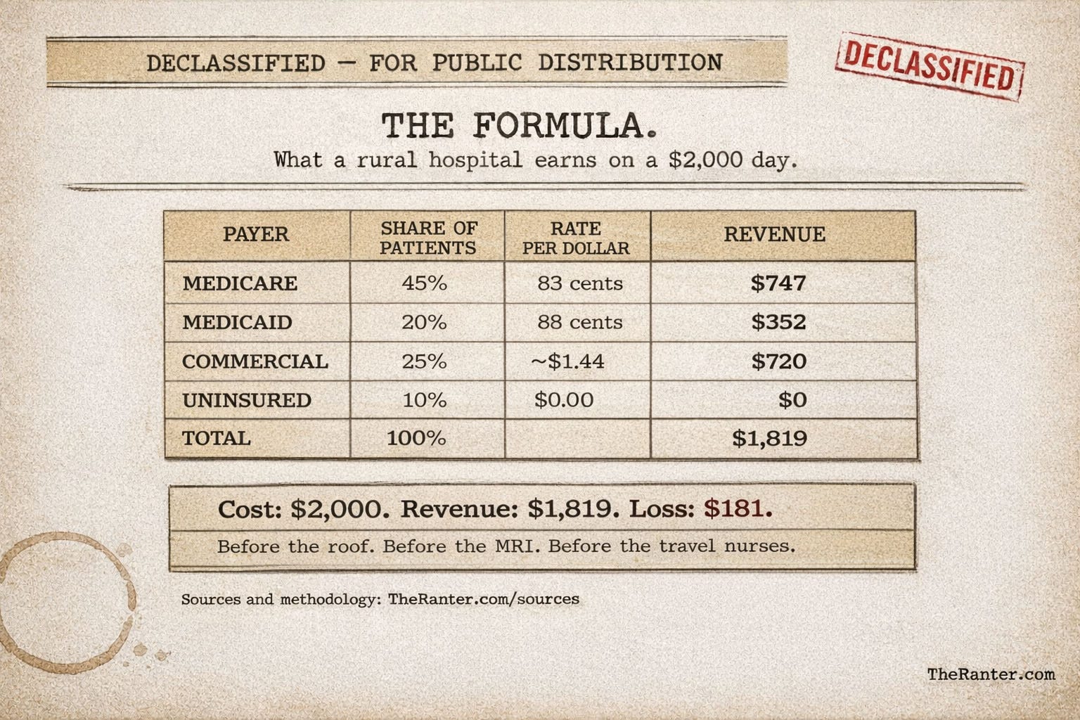 The math was not designed to close rural hospitals. It was designed for a system where someone else would cover the difference. In a rural county where the median age is 58 and the largest employer left in 2009, there is no one else. The math just runs.