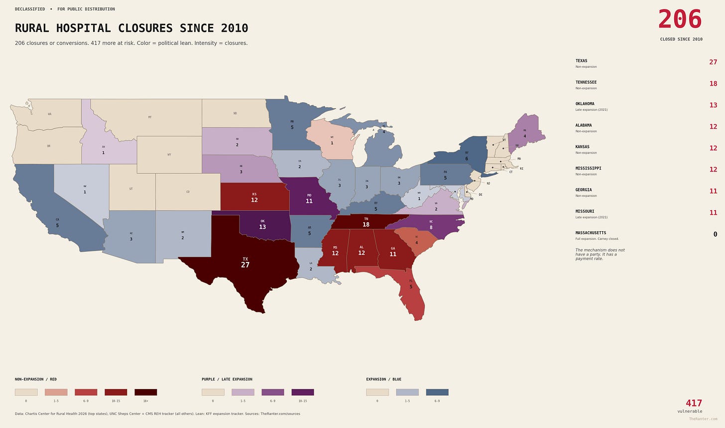 The states that refused expansion made the crisis measurably worse. That is documented. Seventy-four percent of closures in non-expansion states is not a coincidence. AFP spending $300,000 to kill a plan that Tennessee hospitals said would keep them alive is not a policy disagreement. It is a receipt.