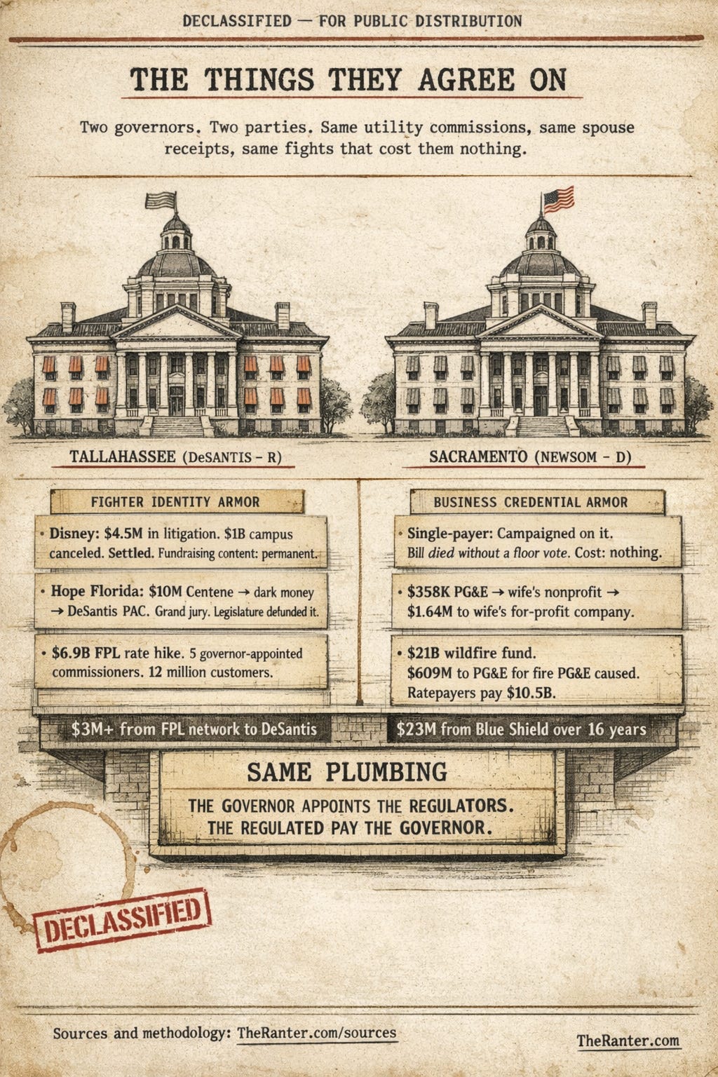 One is a Republican in Florida. The other is a Democrat in California. They agree on one thing that neither will say out loud: the governor appoints the regulators, and the regulated pay the governor.